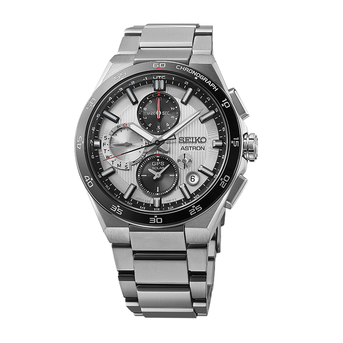 Within a super hard coated titanium case, under dual sapphire glass crystal is a bright ‘silvery night’ dial, with a vertical subdial layout – a first for Astron. This model has its own contemporary feel, with its sleek lines, slim profile, and compact, angular design. It has an almost seamless flow from the case, through the lugs and to the bracelet. Its black ceramic bezel that is also protected by a super-hard coating. This piece was designed to have a low centre of gravity, making it fit well on the wrist.